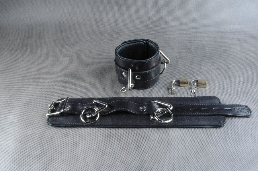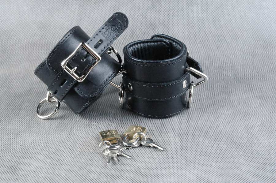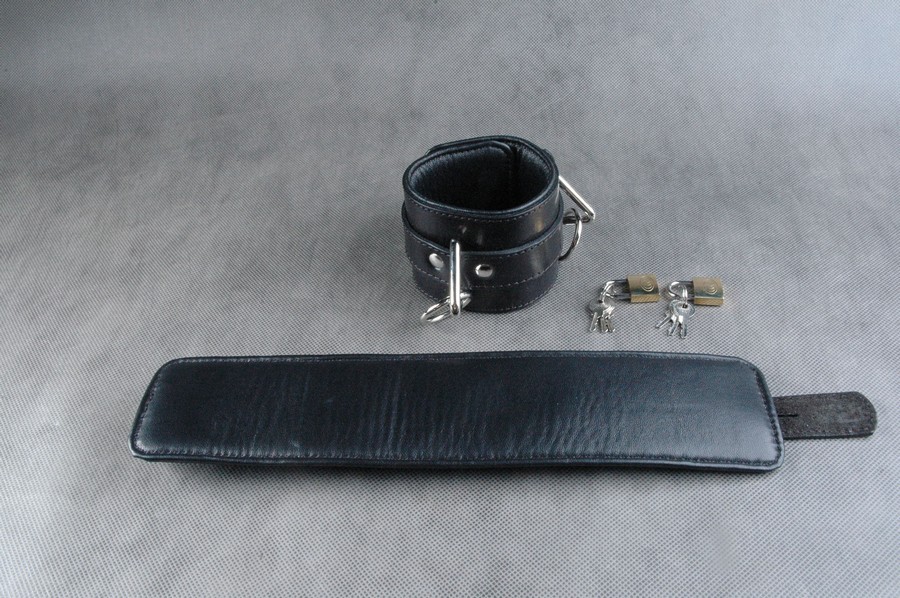 Наножники подвернутые с мягкой проставкой внутри обтянутой черной кожей с подворотом, с 2-мя равносторонними D-треугольниками со стороной 30 мм с кольцом d-25 мм, без соединительной фиксации. Застежка ремешок с элипсными отверстиями и запирающейся пряжкой «бабочкой» с замочком для фиксации. Прямоугольная база шириной 65 мм, с центральным ремнем шириной 25 мм поверх базы.
